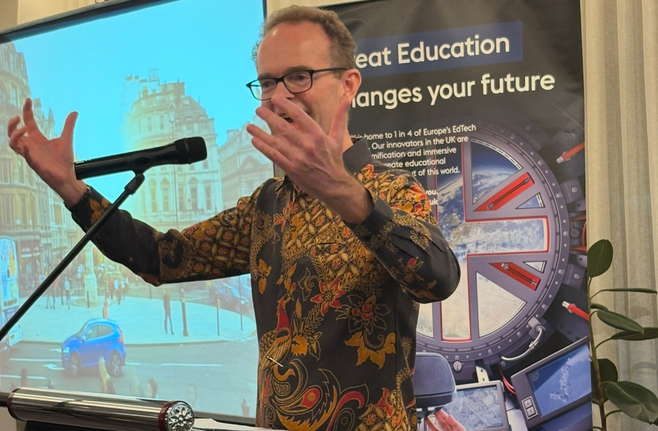 MATASEMARANG.COM – Duta Besar Inggris untuk Indonesia Dominic Jermey menunjukkan antusiasme tinggi ketika memberi sambutan singkat jamuan makan malam di sebuah hotel di Kota Lama Semarang, Rabu (22/10/2025) malam.